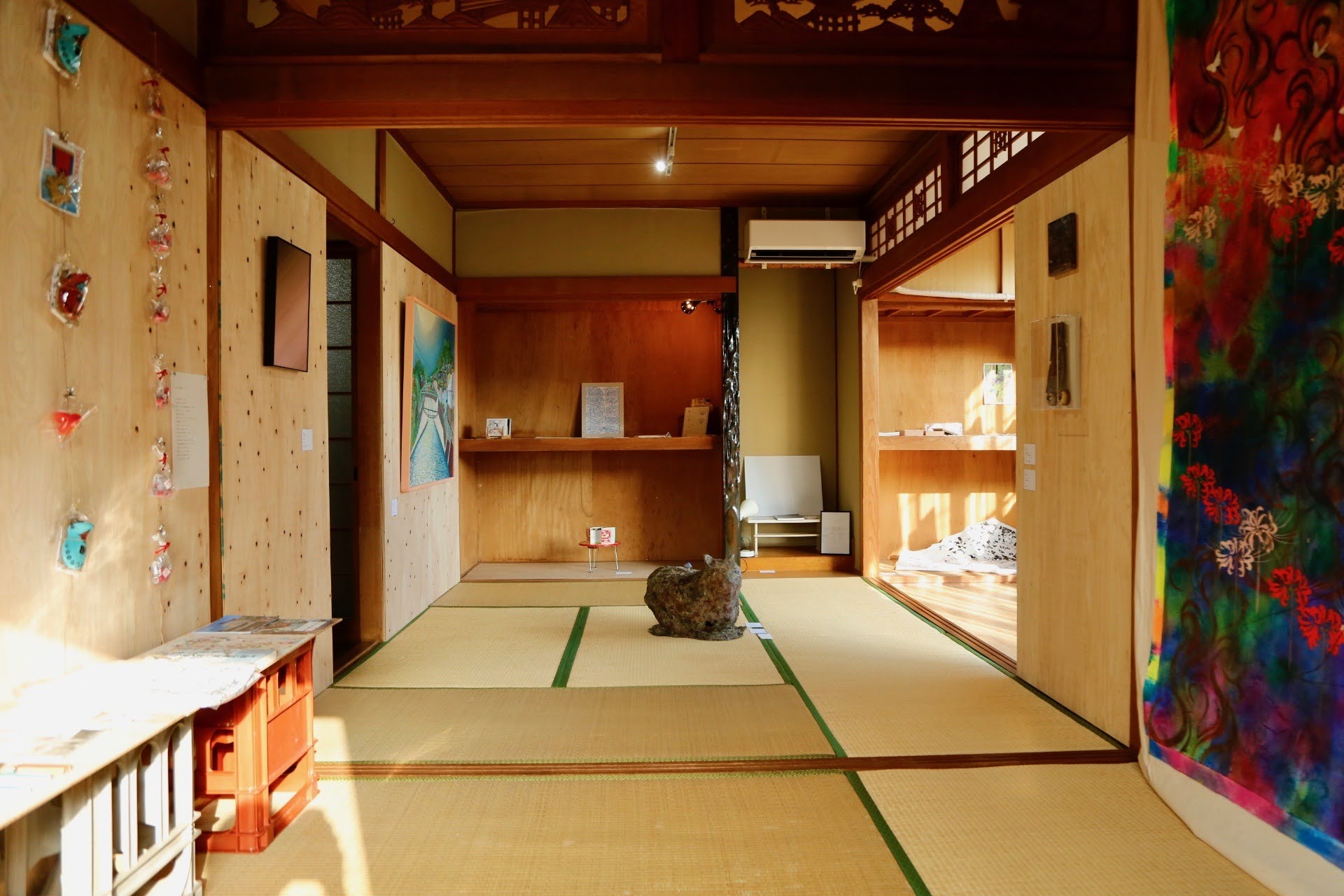 (ゆ)/ドマコモンズは、大分県別府市を拠点に活動するアーティスト・イン・レジデンス/企画チームであり、2019年に橋爪亜衣子と泉イネによって始動した。温泉地として多様な人々を受け入れてきた別府の文化に着想を得て、アーティストや表現者を迎え入れ、内と外の境界が曖昧になる公共浴場のような緩やかな場をつくり出している。理念には「水や空気のように流れる存在でありたい」という思いが込められており、滞在制作に加えて、人や場所をつなぐコーディネーションやリサーチも重視している。2021年からは一軒家を拠点とし、もともと「土間」と表記されていた引越し先の間取りに由来して、約10畳のスペースを「ドマ」と名付けてコモンズ化。現在は地域とアートを結ぶ場として、展覧会、ワークショップ、上映会、トークイベント、藝市 (アートフェア) などを継続的に実施している。ときには2階も活用し、壁に棚や什器を自作で設えながら、DIY感をいかした柔軟な運営を続けている。こうした実践の背景には、橋爪が半年間滞在したインドネシアでの経験がある。特に、ジョグジャカルタで横内賢太郎が運営する「Artist Support Project (ASP)」や、インドネシア文化に根付くシェア精神、個人性の曖昧さ、リソースを分かち合う姿勢は、別府の温泉文化とも共鳴し、ドマコモンズの活動の礎となったいう。現在も、小規模でありながら持ち寄りの精神に支えられ、地域のアーティストとネットワークを育みながら、多様な人々の出会いと実験を媒介するコモンズとして展開を続けている。